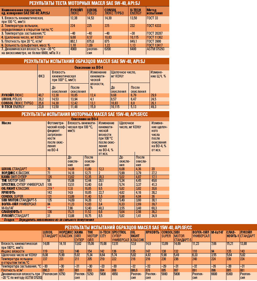 Мы продолжаем серию публикаций по тестам моторных масел, начатую в «АВТОДЕЛА» №5 2004. Задача нашего теста – проверить, соответствуют ли заявленные производителем особенности реальным характеристикам продукта. В этот раз исследовались масла двух категорий: полусинтетика с индексом вязкости SAE 5W-40 и «народная минералка» SAE 15W-40. До этого испытаниям подвергались полусинтетические масла SAE 10W-40 категорий API SG-SH (№5 2004) и API SJ-SL (№15 2004).