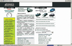 Далее переходим на страницу «Автомобили» и выбираем раздел «Отечественные с пробегом». В этом разделе представлены три производителя: ВАЗ, ГАЗ, ИЖ. Также можно вывести весь прайс-лист, но необходимо учитывать, что в этом случае выводится информация и по зарубежным производителям. Как было оговорено во вступлении, нас интересует ВАЗ 2109. Поэтому заходим в соответствующий раздел каталога моделей. В день просмотра сайта на выбор предлагалось семь автомобилей 1998—2003 годов выпуска. Для каждого из них был указан год выпуска, тип кузова, комплектация, цвет, цена в долларах США и цена в рублях. Причем цвет для большинства из них указан не на словах, а в виде цветного прямоугольника. Кликнув на машину 2000 года выпуска, мы получили более подробную информацию, правда, большая ее часть состояла из перечисления технических характеристик, заявляемых заводом-производителем. Из полезной информации оказался только адрес салона, в котором продавалась данная машина. Просмотр остальных предложений показал, что у некоторых машин прилагается фото. Приятной мелочью является возможность сравнения выбранной вами машины с любой другой из текущего прайс-листа.