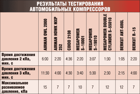 При тестировании в первую очередь во внимание принималась скорость накачки, обеспечиваемая компрессорами. При этом фиксировалось время, на протяжении которого давление в изначально полностью спущенной шине достигало контрольных значений — 2 и 3 кПа соответственно. Для кого скорость накачки является главным критерием при выборе компрессора, сразу отправляем к сводной таблице. А тем, кто все-таки интересуется, насколько отличаются аппараты по удобству пользования и комплектации, советуем-таки прочитать тест целиком, материал обещает быть интересным.