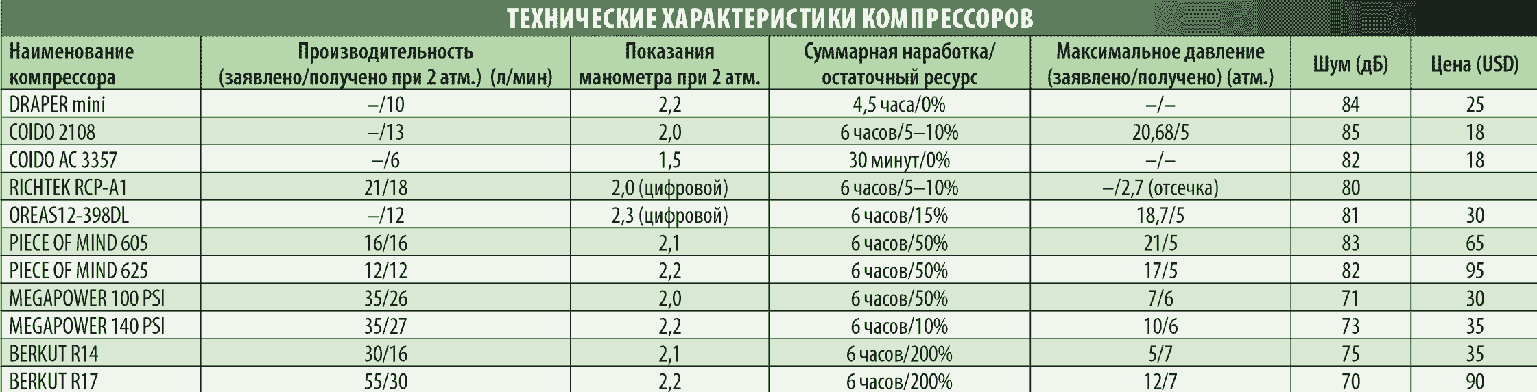 В ходе соревнований были подтверждены или опровергнуты паспортные данные компрессоров, а также дополнены некоторыми отсутствующими данными. Для каждого компрессора стали известны: производительность (при давлении в 2 атмосферы), расхождения в показаниях собственных манометров со штатным манометром тарированной емкости, остаточной ресурс после суммарной наработки 6 часов (определялся на вскрытии), максимальное давление и шум на расстоянии 1 метр. Опираясь на производительность компрессора, довольно просто рассчитать время накачки любой шины. В дальнейшем для каждого компрессора будет указано расчетное время накачки шины R14 175/65, взятой за образец.