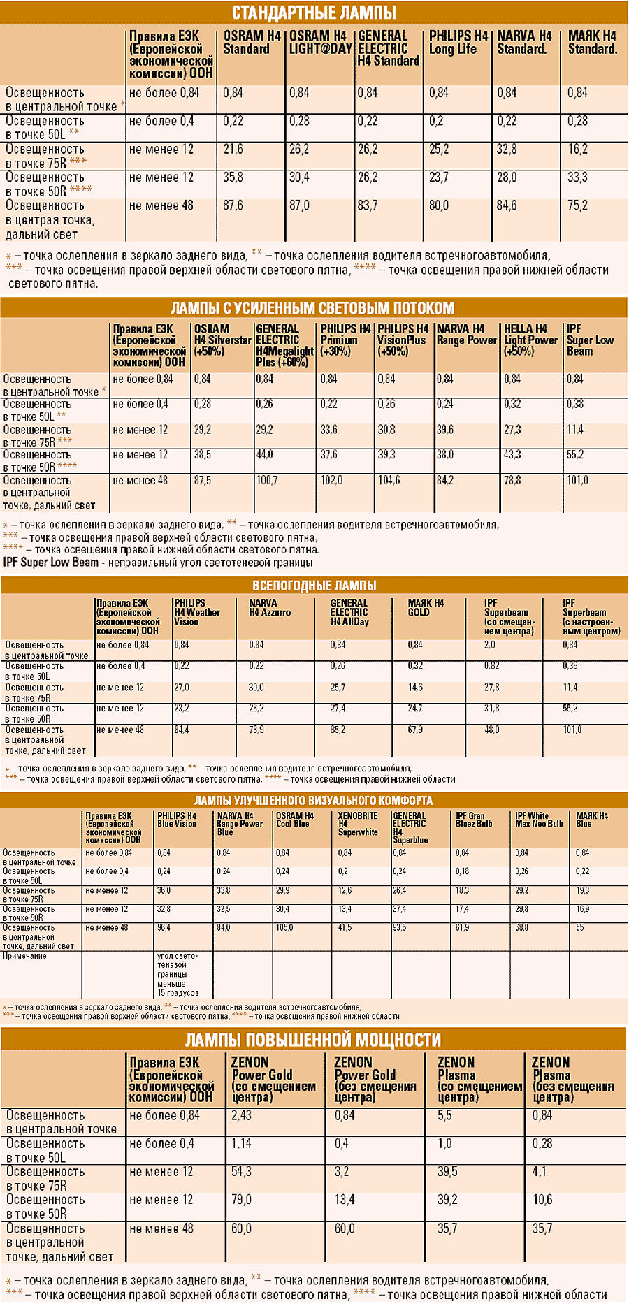Из всех стандартных ламп PHILIPS H4 LongerLife имеет самую низкую силу света в точке ослепления водителя встречного автомобиля. При этом освещенность в рабочей зоне достаточно высокая. Освещенность в центральной точке – точке свечения в зеркало заднего вида попутных автомобилей – была, как обычно, выбрана стандартная для всех ламп.