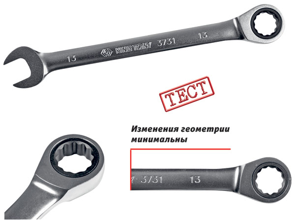 Данный ключ имеет очень приятное на ощупь слегка матовое покрытие. На поверхности ключа выбиты обозначения размеров зевов, а также название марки с эмблемой. У храпового механизма снаружи видно только подвижное 12?гранное кольцо. Кроме того, для механизма характерно достаточно малое сопротивление обратному отводу ключа. Геометрические размеры зевов имеют отклонения, удовлетворяющие требованиям ГОСТа.