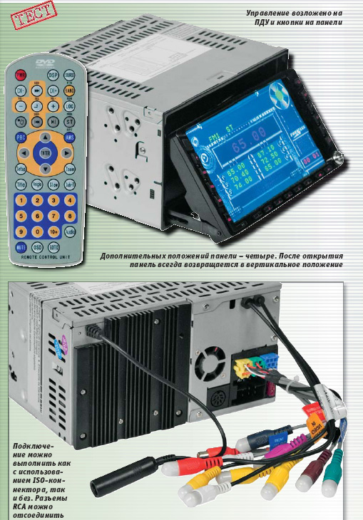 Мультимедийный головной AV-блок стандарта 2DIN МОНИТОР: диагональ – 6,5”. Разрешение – 1200х234 точек. Формат дисплея – 16:9. Форматы изображения – 16:9, 4:3. УСИЛИТЕЛЬ: максимальная выходная мощность 45 Вт х 4. ТЮНЕР: расширенный FM диапазон. Память на 18 FM и 12 AM станций. Переключатель стерео/монo. Выбор дальний/местный прием. Автоматическое занесение станций в память. Сканирование предустановок. ПРОИГРЫВАТЕЛЬ: диапазон воспроизводимых частот: 20–20 000 Гц (DVD, частота дискредитации 44,1 кГц). Соотношение сигнал/шум – 100 дБ (DVD, частота дискредитации 96 кГц). Динамический диапазон – 100 дБ (DVD, частота дискредитации 96 кГц). ПОДДЕРЖИВАЕМЫЕ ФОРМАТЫ И СОЕДИНЕНИЯ: DVD, VCD, CD, mp3, CD-R/CD-RW, DVD-R. НАСТРОЙКИ ЗВУЧАНИЯ: три предустановки эквалайзера. Тонкомпенсация. Ручная регулировка временных задержек для центрального и тыловых каналов. Включение/выключение сабвуфера, динамика центрального канала и тыловых динамиков. Тестовый сигнал. УПРАВЛЕНИЕ И ИНДИКАЦИЯ: моторизованная лицевая панель. СОЕДИНЕНИЯ: ISO-коннектор. 2 пары линейных выходов. Выход на сабвуфер. Выход на центральный канал. Аудиовидеовход. Вход для камеры заднего вида. Видео-выход. Разъем для подключения чейнджера. ЗАЩИТА ОТ КРАЖИ: нет. КОМПЛЕКТАЦИЯ: ПДУ, комплект коннекторов для проводного подключения.