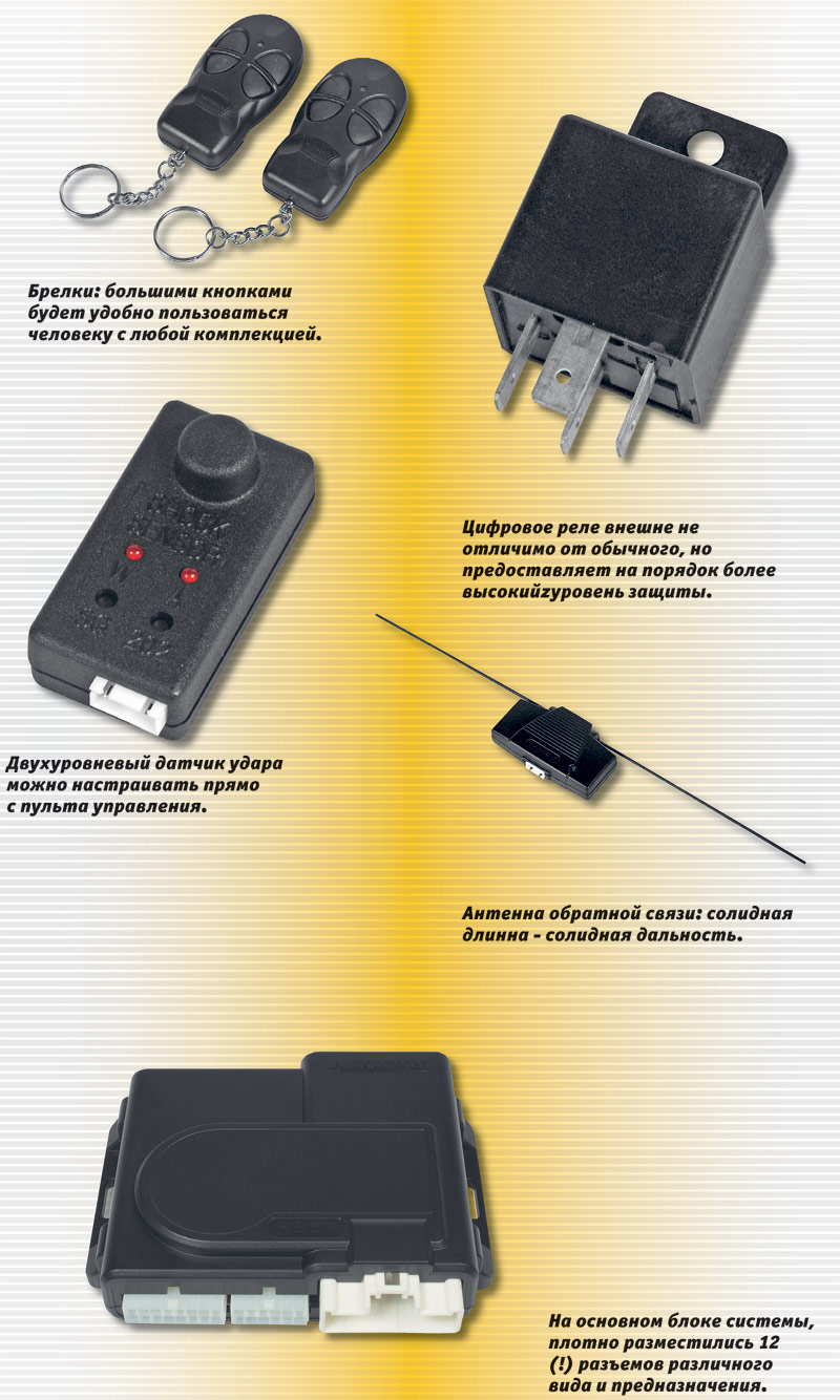 Но если вы наткнетесь взглядом на двустороннюю охранную систему Reef Net R-500D, то поначалу глазу зацепиться будет не за что: два абсолютно черных четырехкнопочных брелока, блок управления, реле и различная фурнитура. Единственным элементом, выдающим способность системы на двустороннее общение, является антенный модуль, устанавливаемый на лобовое стекло. В общем, привычный набор, и за все это великолепие просят более 400 долларов. По неволе начинаешь всматриваться и внимательно изучать любопытный продукт. А то, что он любопытный, понимаешь сразу. Простой пример — страница с описанием возможностей Reef Net R-500D, которых набралось всего-то 7 пунктов, на зато каких! Перечисляем все, без сокращений: охрана автомобиля и защита его от угона; управление брелоком с двусторонней связью и защитой от перехвата команд; дистанционное оповещение с помощью брелока; дистанционный и автоматический запуск двигателя; оповещение и управление по телефону (при подключении информационно-охранной системы серии Reef GSM); программирование настроек на компьютере; большое количество сервисных функций, и все.