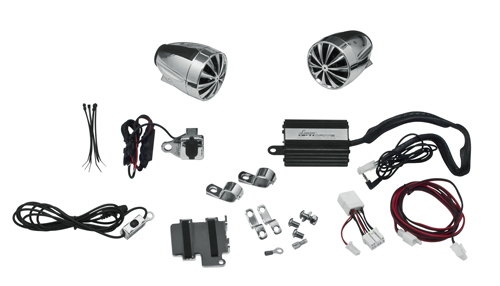 В состав Lanzar OPTIMC90 входит пара мощных динамиков с каптоновыми звуковыми катушками и достойный усилитель мощности. Два 3-дюймовых громкоговорителя, выполненные в литом алюминиевом корпусе, отлично защищены от внешних погодных условий и «перекричат» даже самый мощный мотор. Миниатюрный 700-ваттный усилитель Optidrive скрыто устанавливается на любом мотоцикле, квадроцикле или снегоходе. Его максимальная мощность на два канала достигает 2х350 Вт. Если же вы решите установить еще два динамика, то подключение пойдет по схеме 2+2 с мощность в 87 Вт на каждый канал. Для подключения внешнего источника звука используется 3,5-мм стерео разъем Mini-Jack. С ним Вы сможете подсоединить любой CD/MP3 или MD проигрыватель, подключить iPod или любой другой MP3-плеер. Для совместимых плееров предусмотрено хромированное зарядное устройство с USB входом. Уровнем громкости можно управлять, не отрывая рук от руля, для этого в комплекте Lanzar OPTIMC90 включен универсальный хромированный поворотный регулятор громкости, устанавливаемый прямо на рукоятку. Рабочее напряжение всей системы 12В, в комплект входят хромированные стальные монтажные кронштейны и приспособления. Габариты акустических систем: 122 мм (Д) х 85 мм (Ш) х 85 мм (В), габариты усилителя: 145 мм (Д) х 77 мм (Ш) х 30 мм (В).