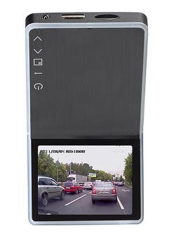 Корпус выполнен в виде объемной черной пластины, изогнутой под углом 120 градусов. На большую сторону крепится кронштейн автомобильного держателя, на меньшей расположен глазок видеокамеры. Шарнир кронштейна легко позволяет расположить камеру на лобовом стекле практически любого автомобиля перпендикулярно корпусу.