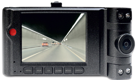 За счет большого экрана видеорегистратор кажется тяжеловесным, но его реальный вес всего 100 граммов. Такой большой экран нужен регистратору, поскольку в нем есть уникальная пока для данного сегмента техники функция демонстрации изображения, получаемого сразу с обеих камер. Для этого экран делится на две половинки, на каждую из которых идет своя часть картинки. При этом пользователь может выбрать один из трех режимов отображения информации: картинка с двух камер, только основная камера или только дополнительная камера. Переключиться можно очень быстро, для этого под монитором есть специальная кнопка.