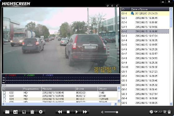 Просмотреть записи можно либо непосредственно на устройстве либо при помощи специальной программы, находящейся на карточке памяти. Без этой программы снять видеозаписи не получится, так как стандартные средства операционной системы компьютера их не видят. Программа, как и большинство продуктов такого типа, синхронизирует видеозапись с показаниями акселерометра (G-сенсора) и GPS-приемника и позволяет накладывать их на электронную карту. Чтобы «вытащить» запись, ее необходимо пересохранить на диск. При этом в записи останутся лишь данные, «впечатанные» в видеозапись, остальные сведения будут потеряны.