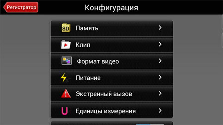 Разработчики неплохо решили вопрос обращения к настройкам программы. Для вызова меню не нужно нажимать в смартфоне или планшете кнопку контекстного меню. Ведь далеко не каждый начинающий пользователь вообще в курсе, что такая клавиша существует и за что она отвечает. Справа на дисплее видна красная вкладка. Если коснуться ее, «выплывут» два небольших значка – вход в список отснятых видеофайлов и, собственно, настройки приложения. Скажем прямо, меню конфигурации в «MyCar видеорегистратор» получилось на пять баллов – наглядное, с понятными пиктограммами. При этом список не перегружен пунктами, а сами вкладки содержат не менее приятные визуально опции. Набор возможностей более-менее стандартный: ограничение памяти для хранения видео, выбор разрешения и качества съемки, назначение единиц измерения и т.д.