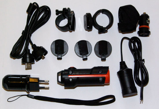 В комплекте прилагается большой набор аксессуаров к видеорегистратору. Из основных – универсальный держатель регистратора, четыре типа креплений (на мотоцикл, на поверхность, на штатив, ременное крепление). Кроме этого, устройство комплектуется сетевым и автомобильным зарядным устройством и водонепроницаемым USB-кабелем и разъемом прикуривателя. Не забыли разработчики и о ремешке на запястье.