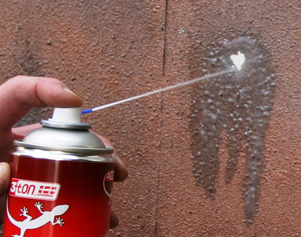 В качестве распылителя используется головка баллончика, на которой находится небольшая трубочка. Используемый пропеллент не указан. Состав содержит хлористые растворители.
