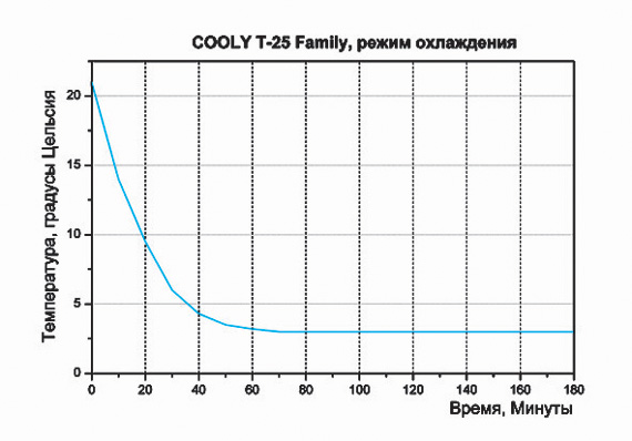ПРОИЗВОДИТЕЛЬНОСТЬ: несмотря на невысокую мощность (32 Вт) и относительно большой объем (22 литра), температура контейнера СООLY T25 Family опускается довольно быстро. За неполных двадцать минут уже были достигнуты контрольные десять градусов. Судя по графику минимум наверняка мог бы быть и пониже; плюс три градуса на табло мультитестера высветились спустя всего шестьдесят минут — такие результаты не по зубам некоторым собратьям по тесту с идентичным объемом и мощностью порядка 50 Вт. Что касается теплоемкости, то здесь холодильник явно отстает от лидера: нагрев до 10 градусов за 25 минут при отключенном питании — это довольно быстро, хотя 21 градус внутри холодильника был достигнут через целых 7 часов — неплохой результат.