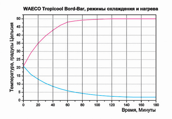 ПРОИЗВОДИТЕЛЬНОСТЬ: охлаждает автомобильный холодильник WAECO Tropicool Bord-Bar немного нерасторопно, до контрольных десяти градусов воздух внутри камеры был охлажден за тридцать пять минут, после этого температура монотонно продолжала падать, и уже через два с половиной часа на циферблате термометра красовались оконечные +2 градуса.