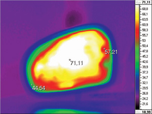 ТЕПЛОВИЗИОННЫЕ ЛАБОРАТОРНЫЕ ИСПЫТАНИЯ зеркала с подогревом: точка с максимально интенсивным нагревом расположилась ближе к центру зеркального элемента. Равномерность нагрева стандартна для этого типа нагревательного элемента.
